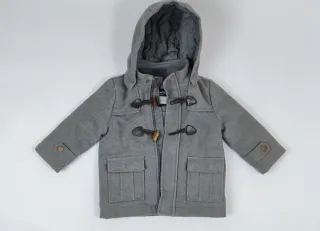 Chaqueta de paño para niño con un diseño clásico. - Cierre de cremallera y botones de madera. - Dos bolsillos delanteros. - Puños con botón. - Capucha forrada. Talla 12 meses