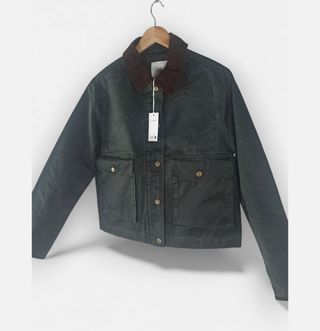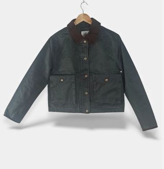 Perfecta para looks casual y de inspiración campestre. Confeccionada en tejido efecto encerado en color verde oscuro y forro interior suave, es una prenda ideal para entretiempo: ligera, cómoda y con mucho estilo. Diseño tipo sobrecamisa con cierre frontal de botones automáticos metálicos y dos amplios bolsillos de tapeta en el pecho. El cuello de pana en color marrón le da el toque clásico y elegante propio de las chaquetas outdoor británicas. La prenda está nueva a estrenar y mantiene todas las etiquetas. Talla y medidas (XS) Pecho (de sisa a sisa): 56 cm Largo de manga: 55 cm Ancho de espalda (hombro a hombro): 42,5 cm Largo: 55