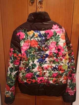 Bonita chaqueta acolchada de Peace & Love, negro y estampado flores, con cremallera, cuello subido y dos bolsillos. Talla S. Hombros 38,sisas 42 y largo 59cm. Poco uso.