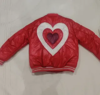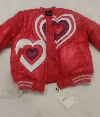 chaqueta original de la marca Desigual para niña. Perfecta para añadir un toque divertido al armario. - Diseño con corazones superpuestos en la espalda. - Acabado brillante y acolchado. - Puños y bajo elásticos con detalles plateados.