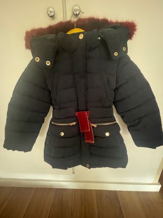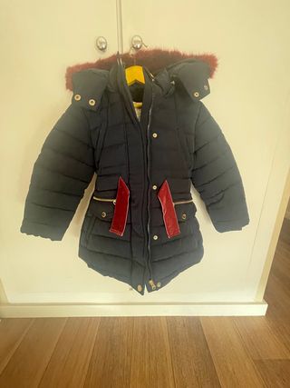 Chaqueta de invierno en color rojo, ideal para mantener el calor. Para niño de 2 años a 3 años. - Capucha con detalle de pelo sintético. - Cierre de cremallera frontal. - Bolsillos laterales. - Puños elásticos. (El único detalle es que tiene el nombre de mi hijo con boli en la etiqueta, pero tiene poco uso).
