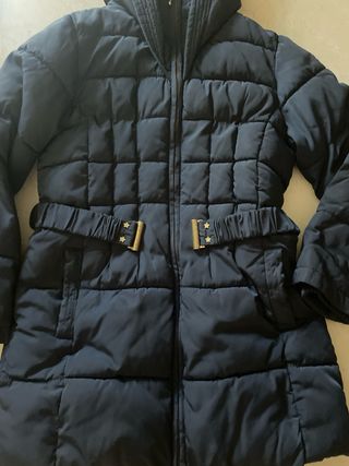 Chaquetón acolchado para niña, en color azul marino. Es una prenda abrigada y cómoda, ideal para los días más fríos. - Diseño con capucha. - Cierre de cremallera. - Cinturón a juego. - Bolsillos laterales.