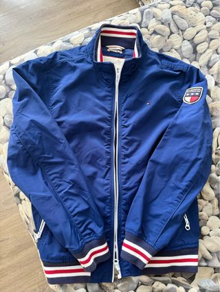 Chaqueta bomber azul de Tommy Hilfiger con detalles en contraste. - Cuello alto con ribetes. - Puños y bajo elásticos con rayas. - Cierre de cremallera frontal. - Parche con logo en la manga.