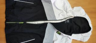 Chaqueta impermeable con capucha para niño, talla 5-6 años. Diseño a rayas en tonos grises y azules. - Cierre de cremallera frontal. - Dos bolsillos laterales con cremallera. - Puños y cintura elásticos. - Capucha integrada. Poco uso, en perfecto estado.