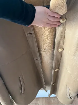 Abrigo tipo pelliza con cuello de borreguito y exterior Antelina..Buena calidad, las medidas en las fotos,está en perfectas condiciones ni manchas ni roces, únicamente un pequeño descosido en la manga tal como se ve en las fotos. - Cierre de botones. - Dos bolsillos delanteros. - Forro interior de borreguito.