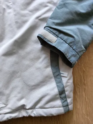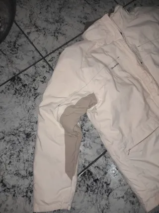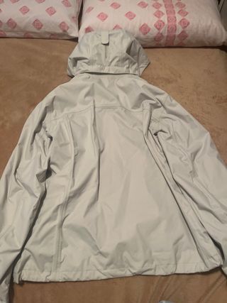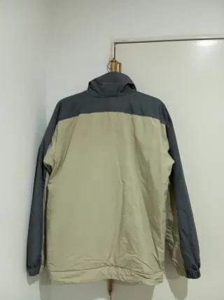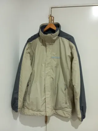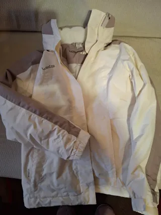 Chaqueta Quechua en buen estado, con un diseño moderno y funcional. - Color principal beige con detalles en blanco. - Cierre frontal con cremallera y botones. - Bolsillos laterales prácticos.