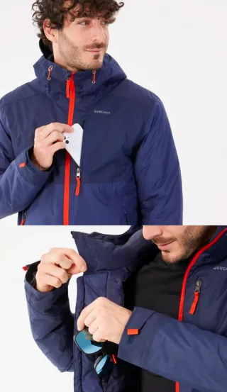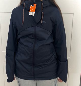 Abrigo Quechua modelo NH500, ideal para montaña. Precio oficial en Decathlon: 44,99€ Olvídate del frío y la lluvia, perfecta hasta -10°C. Se recomienda pedir una talla más si planeas usar un jersey grueso debajo para un ajuste perfecto y mayor confort. - Color azul marino. - Cierre de cremallera frontal con detalles en naranja. - Dos bolsillos laterales con cremallera. - Capucha ajustable.