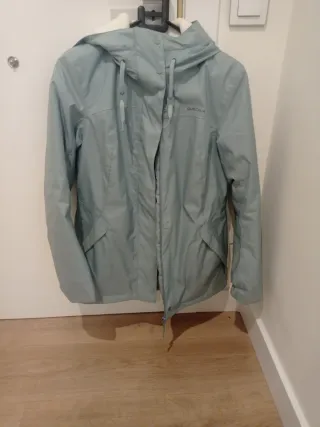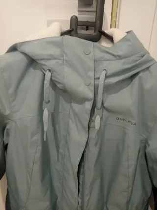 Anorak Quechua de color verde azulado, ideal para actividades al aire libre.Ideal para muy bajas temperaturas,muchos bolsillos interiores de seguridad.Puesto una sola vez para un viaje a Praga. - Capucha ajustable. - Cierre de cremallera. - Bolsillos laterales.