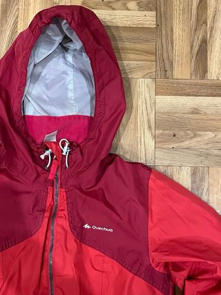 Cortavientos o chubasquero de la marca Quechua. - Diseño con estampado en la parte superior. - Capucha ajustable. - Cremallera frontal. - Bolsillos laterales.