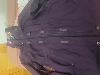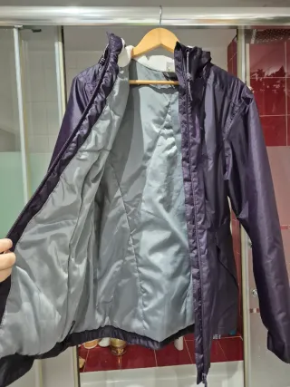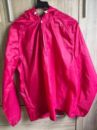 Chubasquero de la marca Quechua en color morado. Ideal para protegerse de la lluvia. - Cierre de cremallera. - Botones a presión. - Forro interior. - tiene algún desperfecto y el último corchete no funciona
