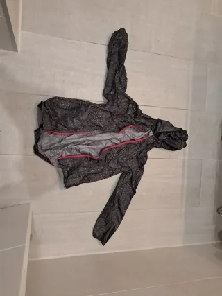 chubasquero cortavientos gris de la marca quechua . Con 2 bolsillos y apertura para ventilación en laterales.