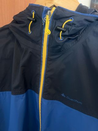 Chubasquero de la marca Quechua en talla M. Perfecto para protegerte de la lluvia. - Diseño bicolor en azul y negro. - Cremallera frontal amarilla. - Capucha ajustable con cordones. - Bolsillos laterales con cremallera.