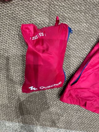 Chubasquero ligero y compacto, ideal para llevar a cualquier parte. Viene con su propia funda para guardarlo fácilmente. - Diseño con capucha. - Cierre de cremallera frontal. - Mangas largas. 50 cm de axila a axila, 65 cm de largo y 62 cm de largura de brazos. Tengo dos unidades sin estrenar. Va metido en la bolsa y no se pierde porque la bolsa es el bolsillo cuando lo abres. Dos unidades iguales en color fresa. Marca Decathlon. Precio por unidad Valido para niñas e ideal para llevar a parques de agua. No abultan nada. Cremalleras en los dos bolsillos