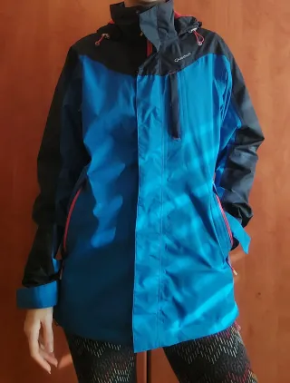 Chaqueta softshell impermeable Quechua, color azul. Abrigo ligero para senderismo en primavera- otoño. Tejido Novadry cortavientos y waterproof. Lleva capucha enrollable. Gomas para ajuste. Puños ajustables con velcro. Talla S (viene a ser una talla 36-38). Estilo unisex. Muy ligera.