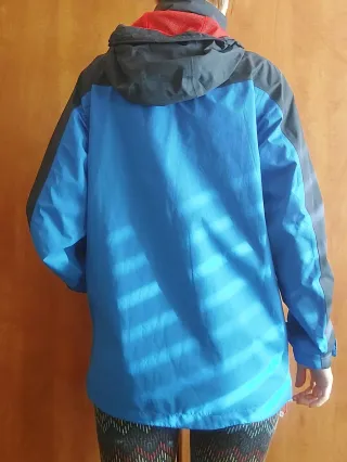 Chaqueta impermeable con capucha, ideal para actividades al aire libre. - Cierre de cremallera. - Bolsillos laterales. - Puños elásticos. PD: tiene escrito en nombre de mi hija, pero se puede tapar.