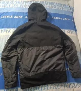 Chaqueta de la marca Quechua, ideal para actividades al aire libre. - Diseño bicolor en negro y gris. - Capucha ajustable. - Cremallera frontal.