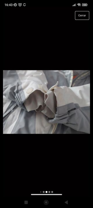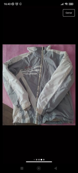 Cazadora cortavientos-chubasquero con polar desmontable mediante una cremallera. Se pueden usar combinados, o por separado. Talla XS, pero talla grande, realmente sería mínimo el equivalente a una S.