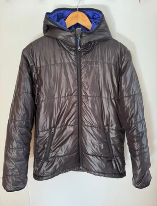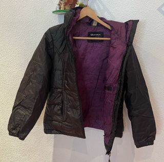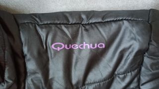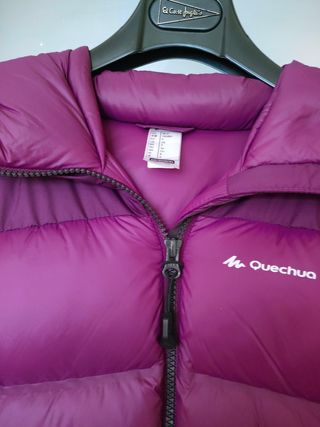 Abrigo acolchado de la marca Quechua, ideal para mantener el calor. - Diseño reversible con interior morado. - Capucha integrada. - Dos bolsillos laterales con cremallera.