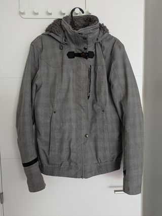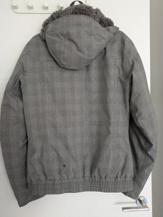 Abrigo de Decathlon (marca Quechua) en gris (como de cuadros). Con cremallera y varios bolsillos. Talla M. En la parte atrás del cuello los pelos están un poco aplastados y apelmazados (se ve en la ultima foto). El resto en buen estado.