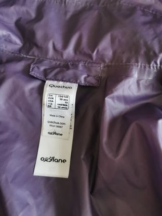 Chubasquero, impermeable quechua. Talla 10 años. Colo morado, usado una vez. No ocupa nada.