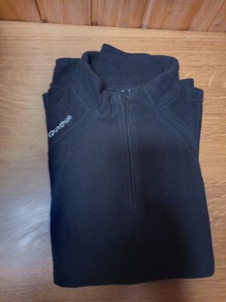 Chaqueta de trekking Quechua en talla M. Ideal para actividades al aire libre. - Cierre completo con cremallera. - Cuello alto para mayor protección. - Bolsillos laterales con cremallera.