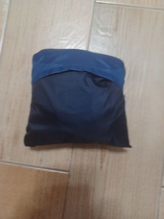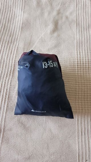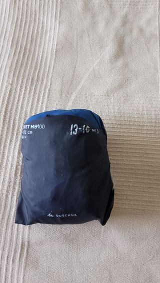 Chubasquero Quechua de Decathlon Modelo actual es Ref. 8549506 a 12.99€ Color azul marino (más oscuro de lo que parece en las fotos) Con cremallera en cuello, capucha, elástico en mangas, bolsillo en lateral y gomas ajustables en capucha y cadera. Se puede guardar por completo dentro del propio bolsillo y queda muy recogido (ver última foto). Talla XS a S. Está sin estrenar.