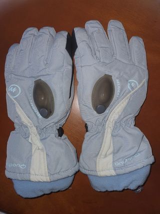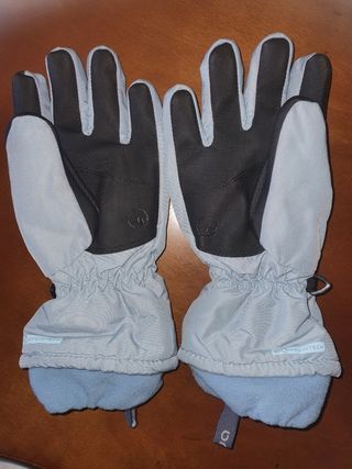 Guantes de nieve Quechua en tonos azul y blanco, diseñados para mantener tus manos abrigadas. - Material exterior resistente. - Forro interior suave. - Cierre ajustable en la muñeca. - Detalle de logo en el dorso.