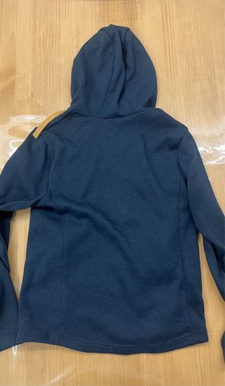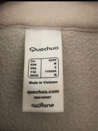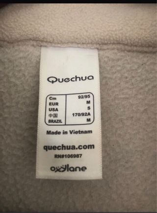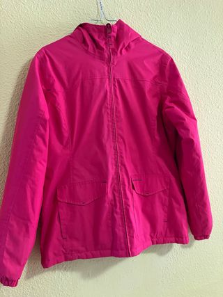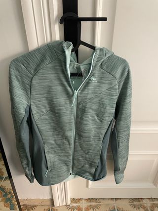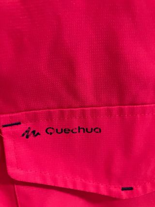 Chaqueta Quechua con capucha, ideal para actividades al aire libre. - Cierre de cremallera frontal. - Bolsillo en el pecho con cremallera ( tiene un descosido como se aprecia en la foto). - Puños ajustables.