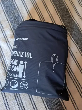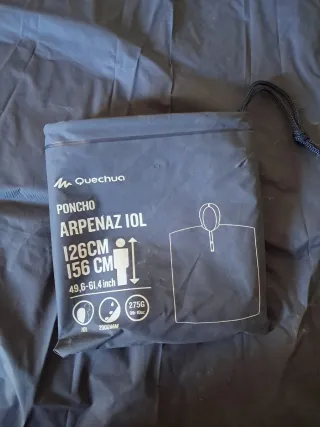 Poncho impermeable Quechua Arpenaz 10L. - Diseñado para montaña y trekking. - Medidas: 126cm - 156cm (49,6-61,4 pulgadas). - Peso: 275g (0lb-10oz). - Impermeabilidad: 2000MM.