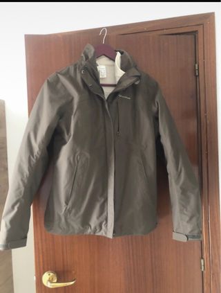 Chaqueta de la marca Quechua, de montaña. Verde oliva jaspeado. Parte exterior de lona. Relleno sintético. Doble puño y doble cintura. Cremallera central, bolsillos laterales con cremallera y botones de presión extra para más seguridad. Bolsillo en parte izquierda del pecho, con cremallera también. Capucha extraible. Cuello con material polar. Abriga muchísimo, para climas fríos. Pesa 1.25 kilos. Está en muy buen estado.