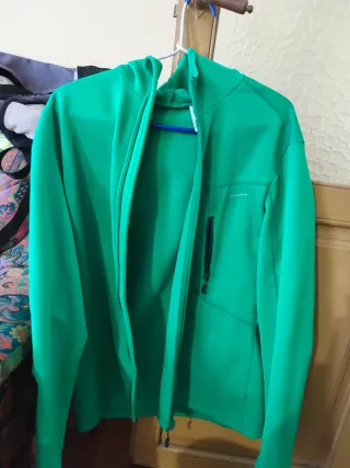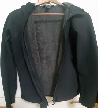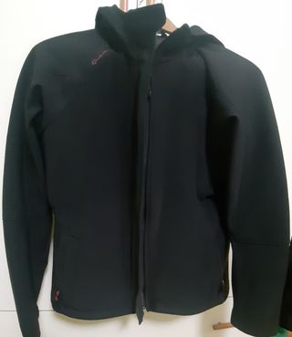 Chaqueta tipo softshell con cremallera completa. - Diseño con capucha. - Bolsillo con cremallera en el pecho. - Puños elásticos. - Usada en buen estado. - XL.