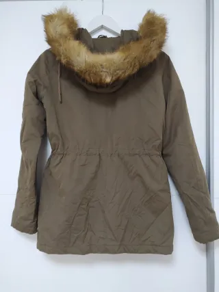 Chaqueta acolchada en un bonito tono verde oliva. Lleva capucha. Cierre con cremallera y botones de presión. Dos bolsillos delanteros que cierran con cremallera. Talla L