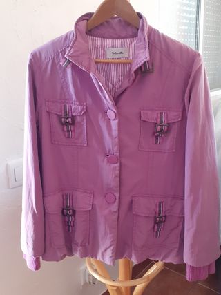 Chaqueta fina para entretiempo de color fucsia con capucha dentro de la cremallera del cuello, con botones plateados y botón a media manga para poder hacer las mangas más cortas. Aunque indica talla 40, sería más una 38 porque no es muy ancha.