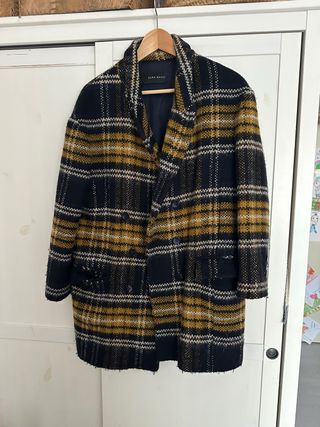 Abrigo de Zara con un diseño de cuadros llamativo. - Diseño de cuadros en negro, amarillo y blanco. - Cuello solapa. - Cierre de doble botonadura.