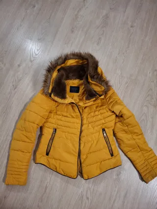 Abrigo acolchado de Zara en color amarillo vibrante. Perfecto para mantenerte abrigado con estilo. relleno de plumón de pato. Es precioso y calentito. Puesto solo una vez. - Diseño acolchado. - Cuello con detalle de pelo sintético en color marrón. - Cremallera frontal. - Bolsillos laterales con cremallera.