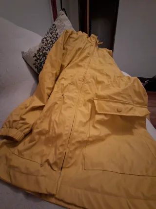 Chaqueta impermeable de color amarillo con capucha. - Cierre de cremallera. - Bolsillos frontales con solapa y botón. - Puños elásticos.