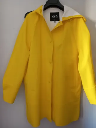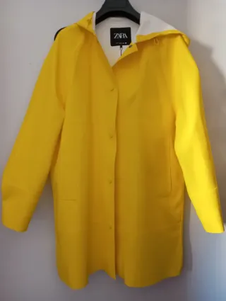 Parka de la marca Zara en color negro y detalles amarillos en el interior. Diseño moderno con capucha. - Cierre principal con cremallera y botones. - Múltiples bolsillos frontales. - Puños ajustables. - Cordón interior para ajustar la cintura.
