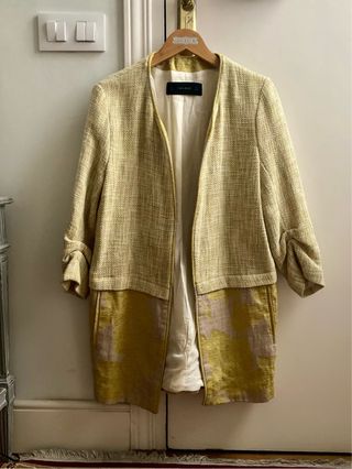 Abrigo de Zara en un bonito color amarillo pastel. - Diseño elegante con solapa. - Cierre de un botón. - Dos bolsillos frontales. Talla XS (da talla)