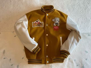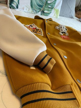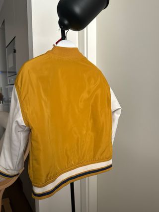 Chaqueta bomber de Zara con un diseño único. - Mangas blancas. - Cuerpo amarillo mostaza. - Parches bordados en el pecho. - Cuello y puños a rayas. NUEVA A ESTRENAR. Precio negociable