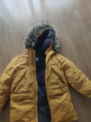 Chaqueta de abrigo para niño con capucha. Dispongo de 2 iguales - Color amarillo exterior. - Forro interior gris. - Capucha con pelo sintético. La chaqueta solo ha tenido un uso, está nueva es de Zara de la talla 10
