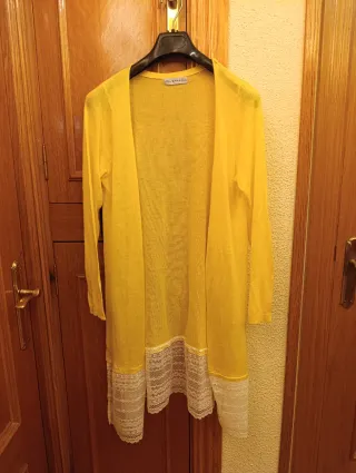 Chaqueta larga de Zara en talla M. De punto fino con detalles de encaje en el bajo. Abertura delantera (sin botones). Tela ligera, muy cómoda.