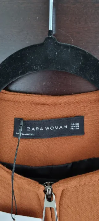 Abrigo de Zara en color camel. Nuevo a estrenar. Con forro interior. Medida de largo 80 cm. - Cuello redondo. - Cierre de cremallera. - Dos bolsillos frontales.