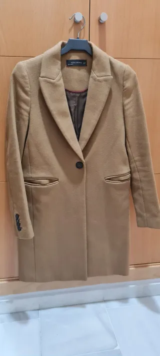 Abrigo de Zara en color camel, en perfecto estado. - Diseño clásico y elegante. - Cierre de un botón. - Bolsillos frontales. - Cuello solapa.
