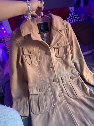 Abrigo nuevo de antelina en color camel, con un diseño moderno y elegante. - Cierre de botones dorados. - Detalle de borreguito en la parte inferior. - Cuello redondo.