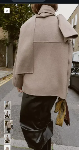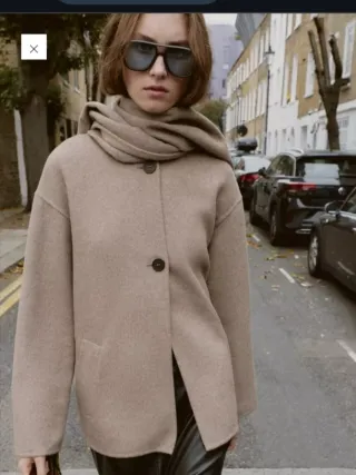 Abrigo corto de Zara en color camel, con un diseño moderno y elegante. Incluye una bufanda a juego. - Cierre de botón. - Bolsillos laterales.