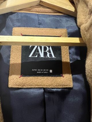 Abrigo largo de Zara en color camel. Presenta un diseño de doble botonadura y cuello alto. - Cierre de botones. - Bolsillos frontales. - Puños con botones. no tiene hombreras y tiene una marca que casi ni se nota en la parte delantera ver foto