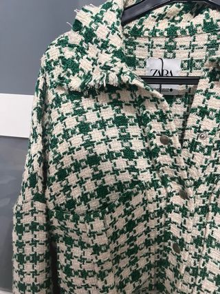 Chaqueta de cuadros de Zara con un diseño moderno y cómodo. - Estampado de cuadros en verde y blanco. - Cierre de botones. - Dos bolsillos en el pecho. - Dos bolsillos laterales.