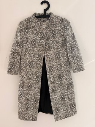 Elegante abrigo de Zara con un estampado geométrico en tonos grises y plateados. Su diseño presenta un cuello mao y cierre de botones. Medidas: ancho pecho 42 cm, ancho hombros 39 cm, largo 88 cm, largo mangas 44 cm - Estampado geométrico. - Cuello mao. - Cierre de botones.