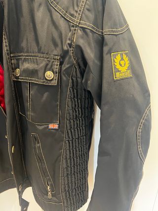 Chaqueta estilo biker de la marca Belstaff. Presenta un diseño clásico con detalles distintivos. - aunque sea una XL el tallaje es parecido a una M del zara - Costuras en contraste. - Bolsillos frontales con botones. - Panel lateral con textura. - Parche de la marca en la manga. - Detalle de bandera Union Jack.