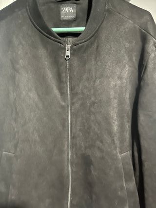 Chaqueta estilo bomber de Zara para hombre. - Material tipo ante. - Cuello y puños elásticos negros. - Cierre de cremallera frontal.